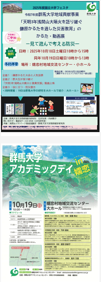 両日には鎌原かるた大会や人気投票、R6地域貢献事業で制作した動画上映、防災グッズの展示を行います。19日は群馬大学の教員が研究成果を披露します。ぜひ、会場にお越しください。内田陽子・院生も大活躍です。