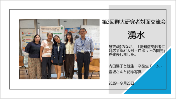 <日本認知症ケア学会:石﨑賞 群大研究室関係者歴代受賞者> 2021年 内田 陽子 タイトル 「訪問看護師を支援する包括的BPSDケアシステム®の電子版」 2019年 伊東 美緒 タイトル 「不同意メッセージ」の概念学習とBPSD発現予防シートの開発 2016年 松原 昇平(内田陽子卒研生) タイトル 「折り紙認知テスト」の開発・折れた工程数と認知機能との関連 2014年 高橋 ちづる(内田陽子卒研生) タイトル 独居の認知症高齢者の暮らしぶりと職員の関わり 2011年 伊東 美緒 タイトル 認知症高齢者を対象とした「寄り道散歩」プログラムの効果 内田 陽子(群馬大学大学院保健学研究科) タイトル 小規模施設におけるアウトカムを高める質改善の取り組み |