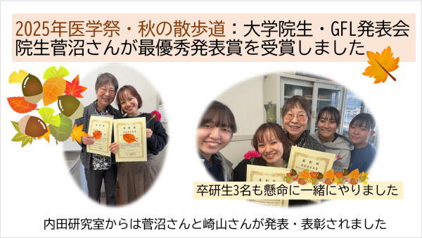 <その他の賞> 2022年3月23日学位授与式でOさんが優秀賞受賞 第68回北関東医学会優秀発表賞 峯浦達雄 ・ 内田陽子 タイトル デイサービス利用の高齢者に対する脳タスク・スタンディング リハビリテーションプログラムの効果 第29回 日本在宅ケア学会学術集会 優秀演題賞 令和6年8月25日 清水 ・ 中本 ・ 河田他 ・ 24名の著者の中 ・ 内田陽子、崎山恵里那 タイトル 認知機能低下のある高齢者の睡眠改善への光に関する介入の効果 システマティックレビューとメタアナリシス |